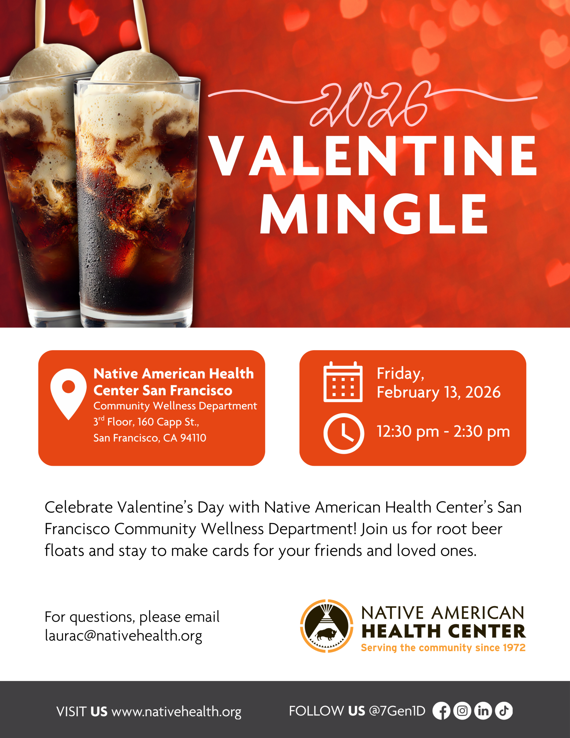 Celebrate Valentine’s Day with Native American Health Center’s San Francisco Community Wellness Department! Join us for root beer floats and stay to make cards for your friends and loved ones.