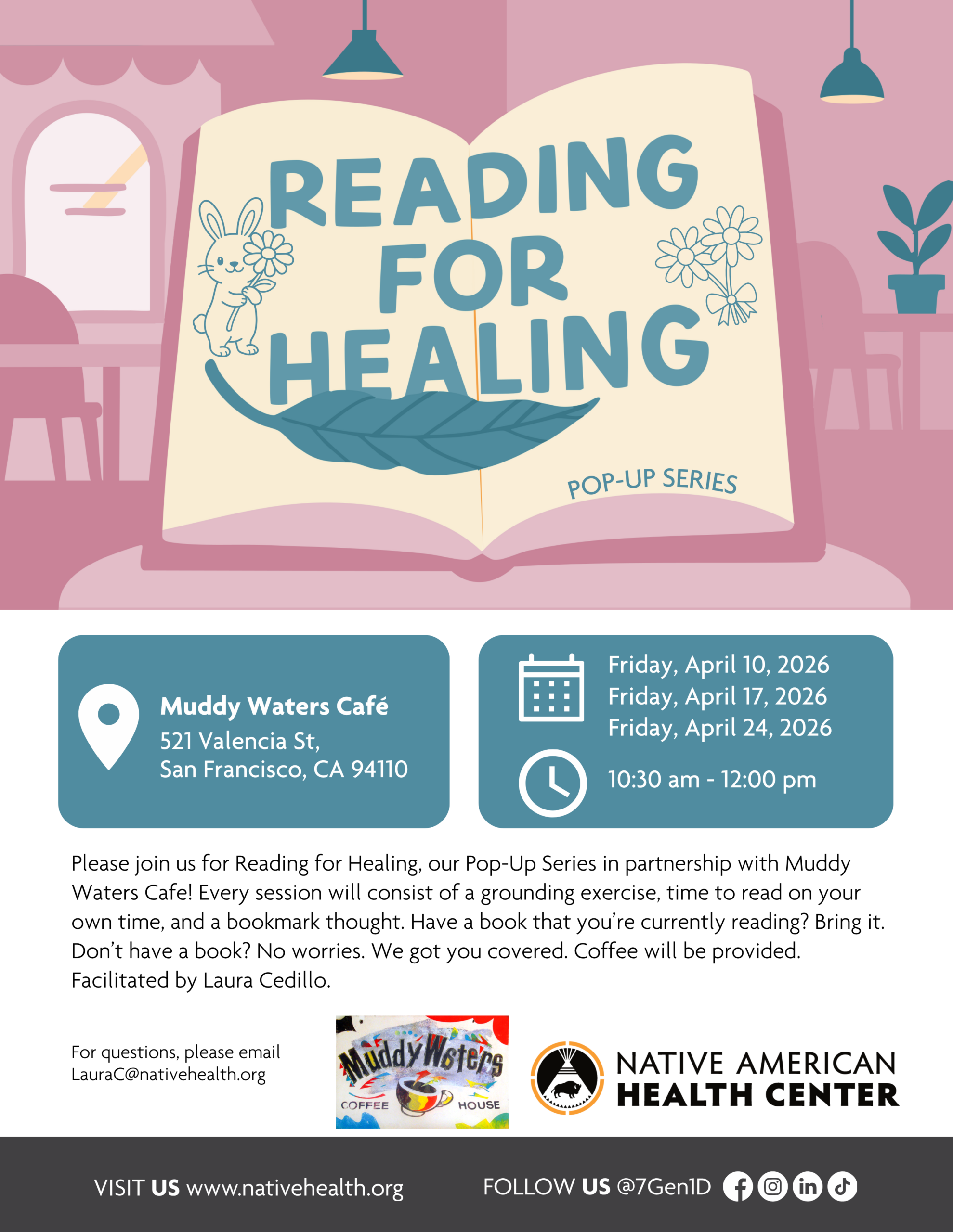Muddy Waters Café 521 Valencia St., San Francisco, CA, United StatesPlease join us for Reading for Healing, our Pop-Up Series in partnership with Muddy Waters Cafe! Every session will consist of a grounding exercise, time to read on your own time, and a bookmark thought. Have a book that you’re currently reading? Bring it. Don’t […]